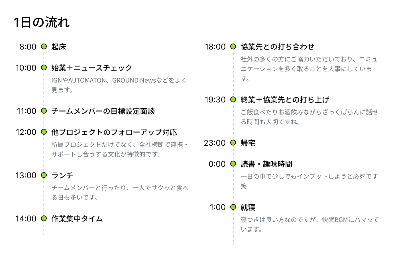 前職までは主にゲーム開発を受託する制作会社で働いていましたが、クライアントワークをメインにキャリアを重ねていく中で「作るモノを決めてみたい。その意思決定に関わってみたい。」という思いが強くなり、転職を決意しました。